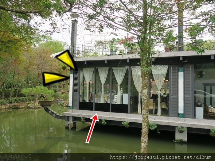 用餐區有兩區,入口處先看見非常顯眼的這棟鋼構水上玻璃屋,也是我們用餐的區域,