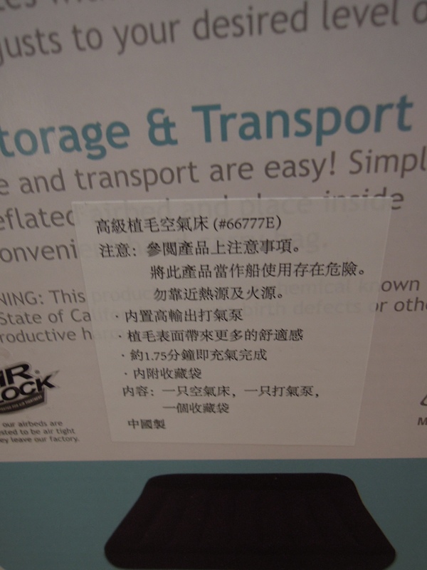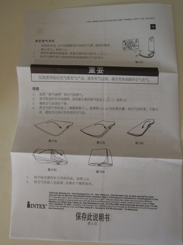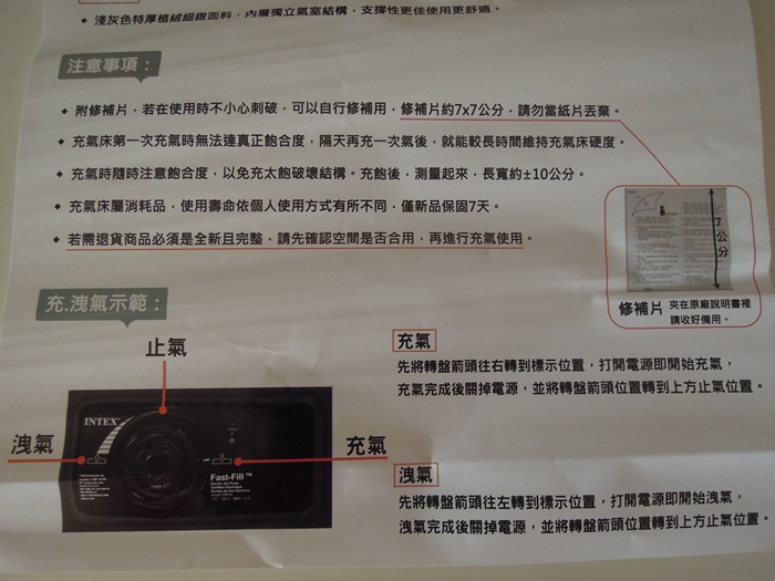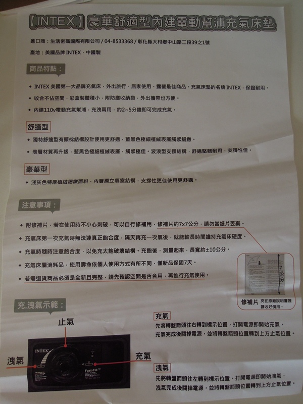 裡頭的說明書,中國製,內建110電動充氣幫浦。